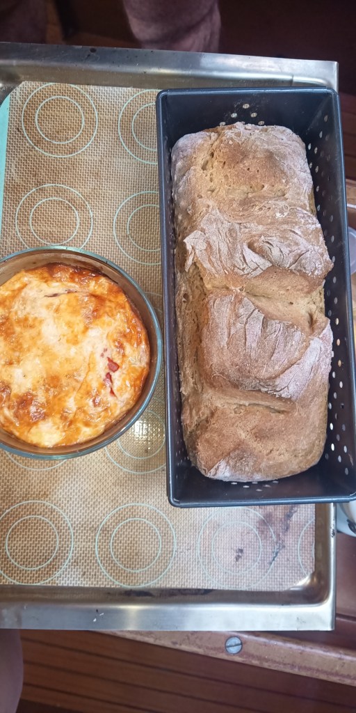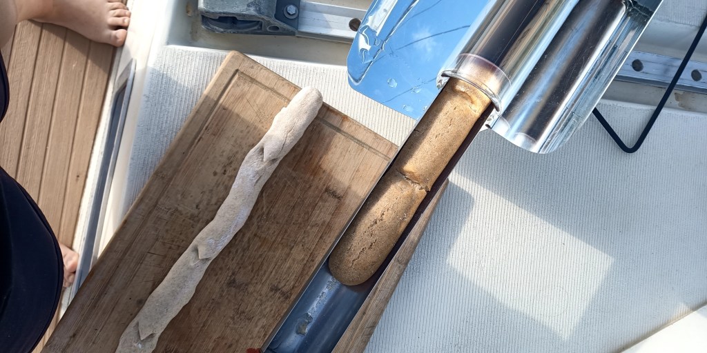 La ration calorique en traversée peut monter à 3000Kcal/24 selon le froid, l’humidité, l’état de la mer, et le mauvais temps. Pour ne pas être malade, il faut s’astreindre à un rythme de vie le plus sain possible : le moins de sucre possible, pas de plat préparé, pas de produit industriel (sauf charcuterie Corse :)).Nous faisons tout nous même, y compris le pain au four solaire ou au four à gaz.