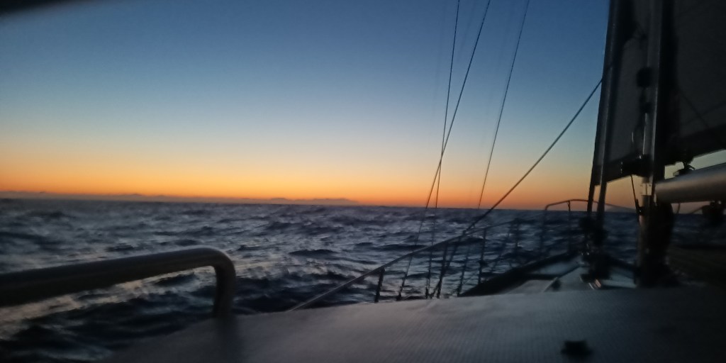 Les 30 heures de traversées sont pénibles car nous sommes ballotés entre la houle de Sud du Sirocco et celle du Mistral de Nord Ouest qui souffle depuis 3 jours à plus de 20 noeuds. Heureusement, un bon vent constant nous pousse au portant. Entre deux rafales, nous respirons, avant qu’une vague scélérate ne nous arrose encore un peu plus. L’alternance de quarts semble de plus en plus difficile mais les miles s’enchaînent, nous filons 7 nd (énorme pour le bateau que nous avons). Aux trois quarts du chemin, l’excitation de voir enfin la côte est à son comble et la nuit sans lune nous offre les étoiles accrochées comme des diamants. Nous avons prévu une arrivée à l’aube.