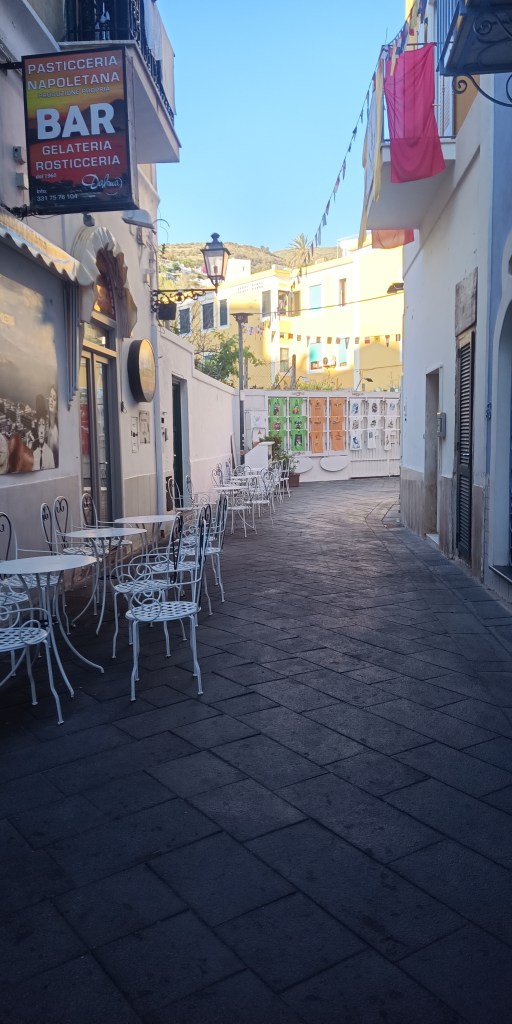 Quelle beauté ! Les petites maisons colorées, les rues pavées, le grand port de pêche où s’entassent des bateaux ventrus d’un autre temps…et au milieu, des ferrys qui défilent par dizaines toute la journée pour apporter le flot des touristes locaux (Romains et Napolitains essentiellement). Ces ferrys contribuent à la houle locale, force 4 qui n’est présente que de 9h à 19H…encore une preuve de la nuisance humaine jusqu’au fond de la Méditerranée (il faut bien qu’il y ait des imperfections).