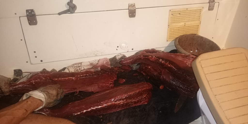 Comment ne pas parler d’Ibiza et de Formentera. La traversée dure une nuit entière et celle-ci est ponctuée par la pêche d’un thon magnifique de 30kg (assez de poisson pour 3 semaines !), 1 HEURE 30 d’efforts intenses et voilà la bête sur la pont ! Vu l’état de la mer, avec des creux de deux mètres, la découpage se fera à l’arrivée !