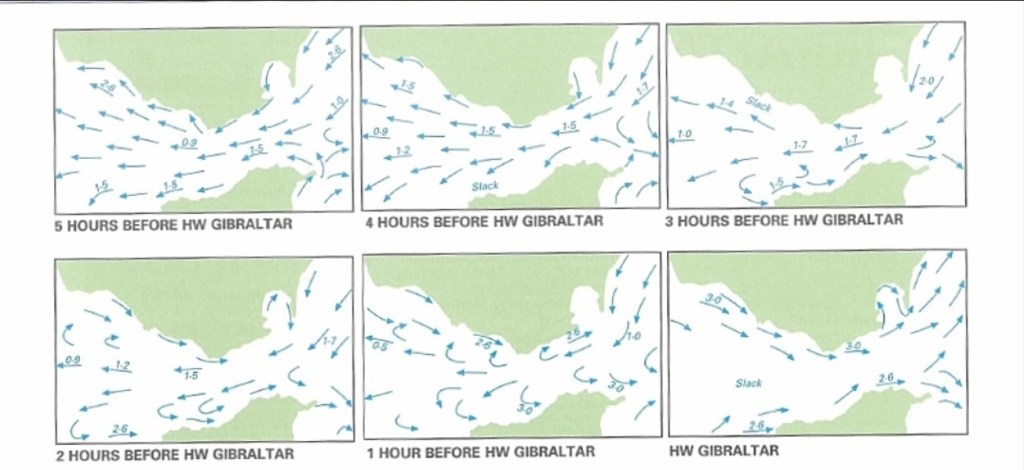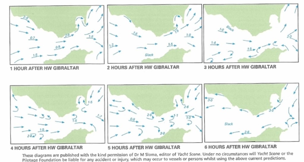 Pour profiter de la toute puissance du courant sacré, il nous faut partir 3 heures après la marée haute à Gibraltar ; par chance ça nous donnait 9h30 du matin, de quoi faire une bonne grasse matinée. Détail important : si un vent fort d’ouest survenait la veille, les courants seraient grandement modifiés. Or, la veille, les vents se sont calmés, la fenêtre est donc grande ouverte mais pas pour longtemps.