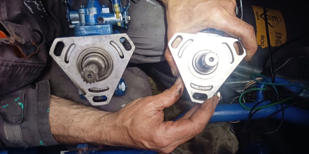 Je ne cacherai pas au lecteur que mon sang n’a fait qu’un tour. L’équipage, pris au dépourvu, décide de changer la pompe d’injection au mouillage, free style et foutu pour foutu, et il s’avère que le capitaine en plus de nous avoir sauvés avec son démarreur de secours utilisé à Port Vendres, a également, bien caché dans les cales une petite pompe d’injection toute jolie, tarée et prête à l’emploi !