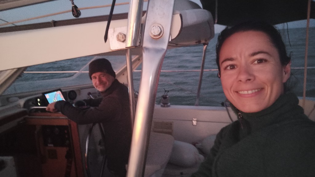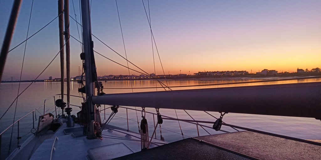 Dès le lendemain, appareillage à l’aube, lever à 5h30, nous avons 100 nM à parcourir avant le coucher du soleil, les journées durent très longtemps à l’ouest et il est une heure de moins au Portugal, gros avantage (mais pas pour le calcul des marées!)