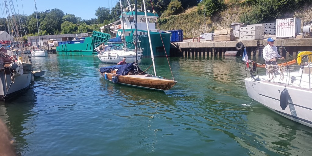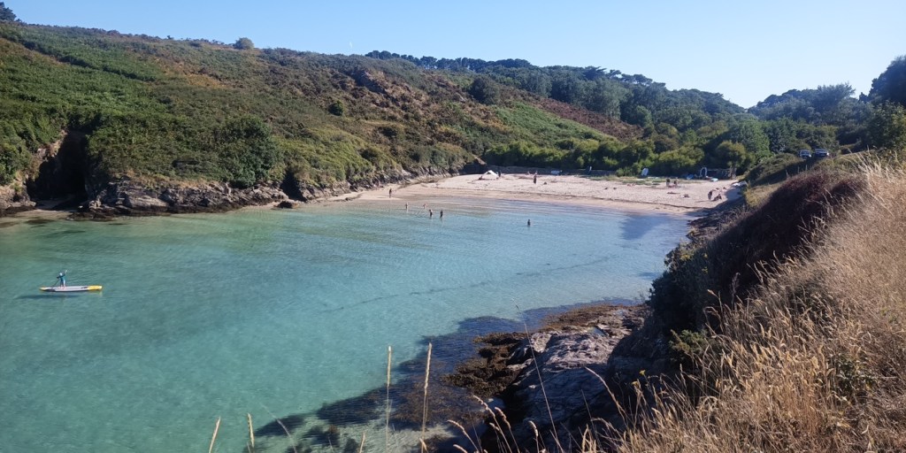 Nous sommes à la recherche d’un abri pour changer notre poulie de trinquette cassée en tête de mât (pas envie de vomir sur le capitaine à cause de la houle). Notre choix se porte à quelques miles de la baie de Lorient, dans un calme absolu. La baie est immense; nous sommes seuls au mouillage, tellement seuls pendant 3 jours que nous finissons par nous demander si nous avons le droit d’être ici (il semble que oui).