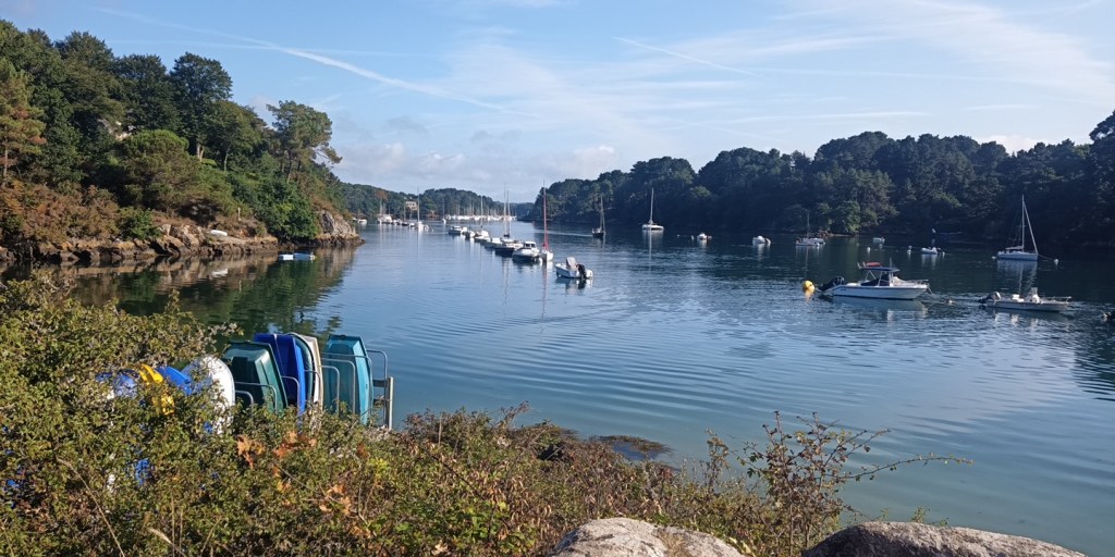 Une découverte bien inspirante a été mise sur notre route : Port Manech. Il est impossible de décrire ce village et cette embouchure tant cela est joli. Après un mouillage timide comme toujours (Fabrice mouille toujours à 500m de la plage et à 5 mètres de fond à marée basse :), l’annexe touche le quai flottant du petit Port Manech. Nous parcourons les quelques kilomètres qui nous mènent sur la route de Pont-Aven entourés de plages de sable blanc, d’oiseaux en nombre, et du flux tranquille et doux du fleuve, tout cela dans un silence absolu.