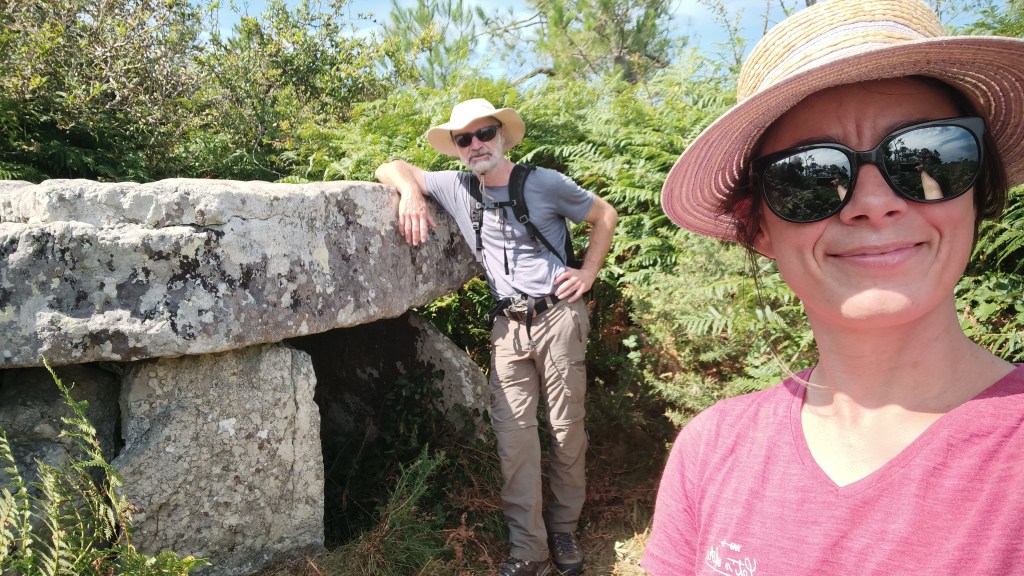 Il semble que notre sentier nous mène droit sur un Dolmen; le sang (partiellement) Breton de Fabrice bouillonne de désir de voir ce dolmen. Loupé une première fois, puis une seconde fois…Google maps finit par nous dire qu’il faut sortir du GR, prendre la départementale puis faire un autre détour pour le trouver. On va résumer brièvement la situation. Nous sommes partis sur une randonnée de 20km, sous un ciel bleu azur et une chaleur assommante, sans vent. Nous devons faire un détour de 30 minutes pour trouver un dolmen ancestral, et marcher de nouveau sur une départementale et encore sous un soleil de plomb, évitant les voitures de parisiens déjà en retard sur les horaires d’arrivées. Il aura fallu que Fabrice use de tous les arguments possibles pour me convaincre, mais il est fort le bougre !