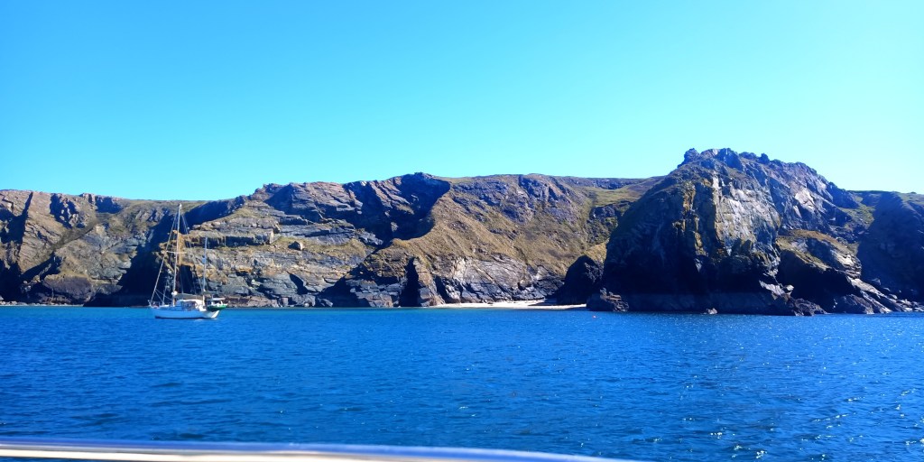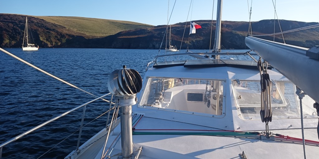 Toutes voiles dehors, génois, grand-voile et artimon, nous filons entre 8 et 10 noeuds sous 25 noeuds de vent bien établi (économies de gazole en vue !). Après 24h de traversée, nous arrivons dans la baie de Penzance, au sud ouest de l’Angleterre, pays de Cornouailles, avec ses jolies collines verdoyantes, avant de viser un petit mouillage abrité et ravissant. Un autre vieux ketch anglais sera notre voisin, lisant son journal avec le flegme qu’on peut attendre d’un local. La baie est splendide, sable fin (vous n’allez pas nous croire, mais on voit le fond, une première depuis la Méditerranée !), soleil, rochers immenses parsemés d’oiseaux marins et pas de houle :).