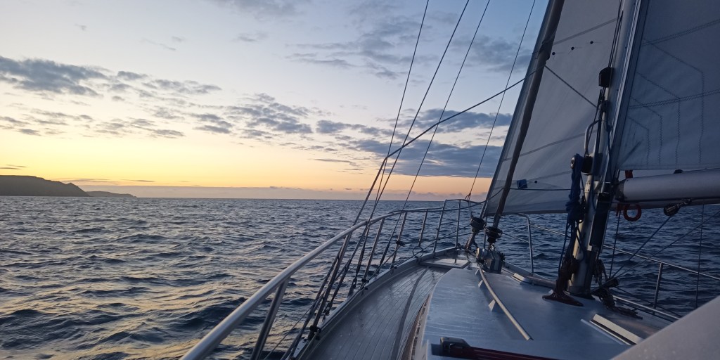 Le loch s’affole, le Nos Limites s’envole sur les flots. La traversée est très rapide, même si nous appréhendons le rail des cargos. Pour être précis, nous ne traversons pas le rail des cargos, mais nous sommes à quelques miles à l’ouest du Rail. Des dizaines de monstres flottants aux couleurs vives nous entourent, d’une apparente tranquillité, mais ne vous y trompez pas, les bêtes avancent entre 15 et 20 noeuds, chargés de tout ce que l’humain fait de pire en matière de pollution :). Nous sommes prêts, alertes, sur le pont, à surveiller les AIS et les coques d’acier, adaptant notre route. Ou pas. De très loin, nous voyons les cargos changer de cap, quelques degrés tout au plus, mais assez pour nous laisser glisser entre eux. Et cela se répète durant toute la traversée. Ainsi donc, ils favorisent les voiliers, si tant est qu’ils aient le temps de les voir. Très agréable pour nous, voileux, qui n’avons pas à changer le cap d’un pouce. Merci les cargos ! Nul doute que si nous avions directement traversé le rail, nous n’aurions pas eu cette chance.