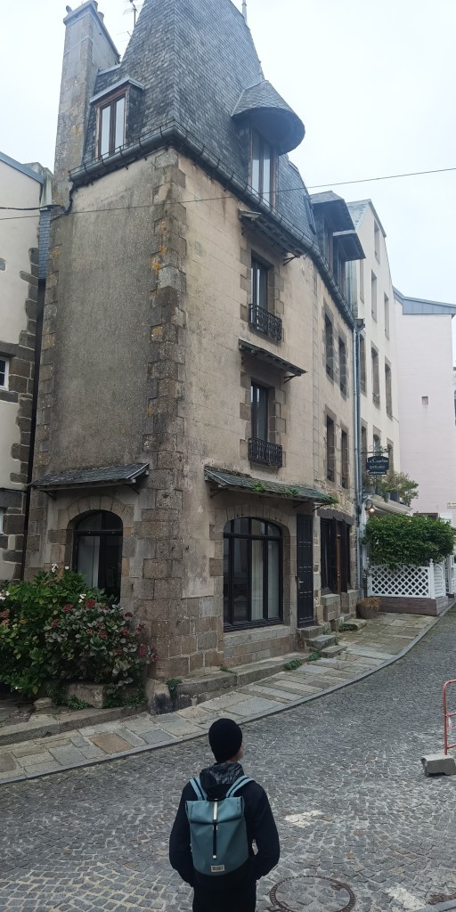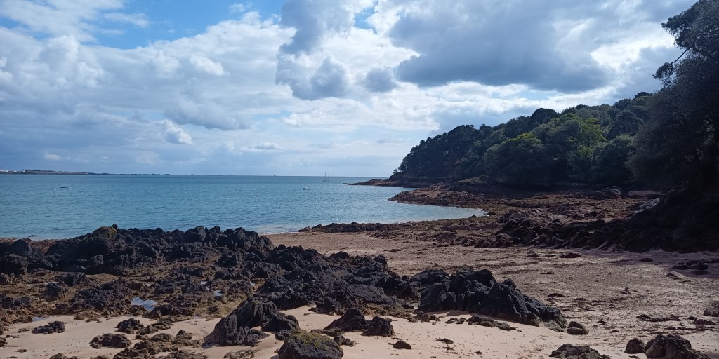 Le débarquement est rock’n’Roll ! Nous attendons que la marée soit relativement haute, afin de moins marcher avec l’annexe sur la plage :). Débarquement entre deux gros rocher, manutention de notre petit dinghy et escalade sur les rochers le long de la plage jusqu’au mignon petit village de St Aubin.