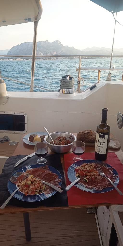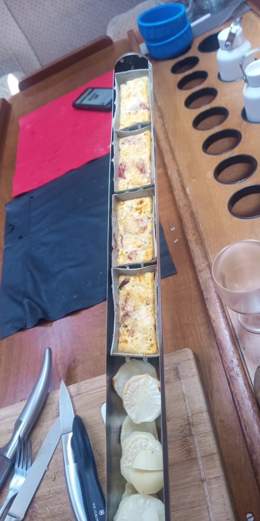 Ceci est notre joker, notre arme secrète. Aucune autre énergie que celle du Soleil (des infrarouges en fait). Il chauffe à 220°; il est donc bougrement efficace. Il existe plusieurs marques, mais celui-ci est très efficient, étant donné son faible volume. Au mouillage, même par temps couvert, cela fonctionne (20 min pour les viandes, 40 pour le riz, 30 pour les légumes, etc…). La règle est simple : quand ça sent bon, c’est prêt ! Il suffit de le réorienter de 15 degrés toutes les heures en raison du mouvement du soleil !